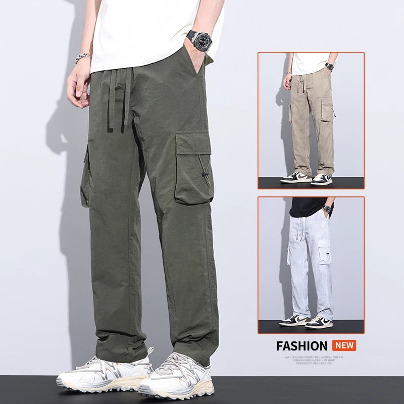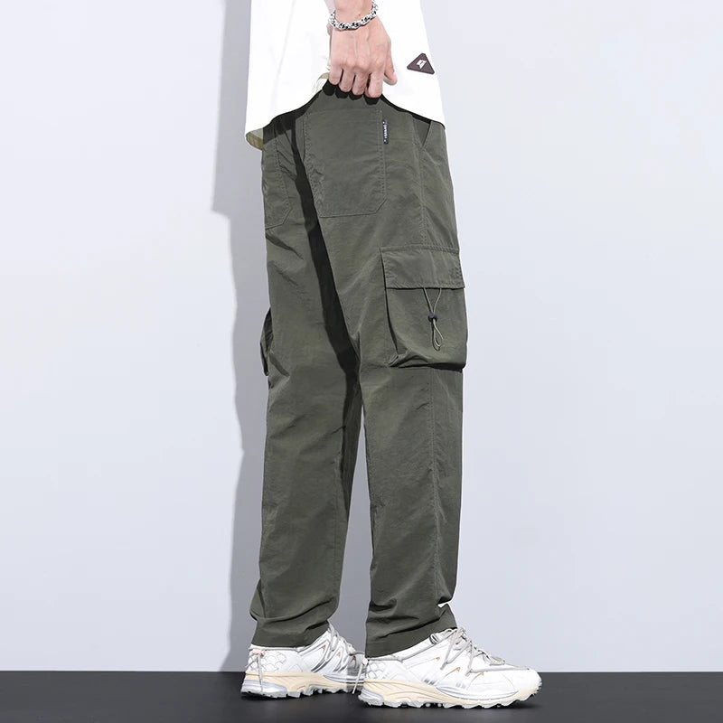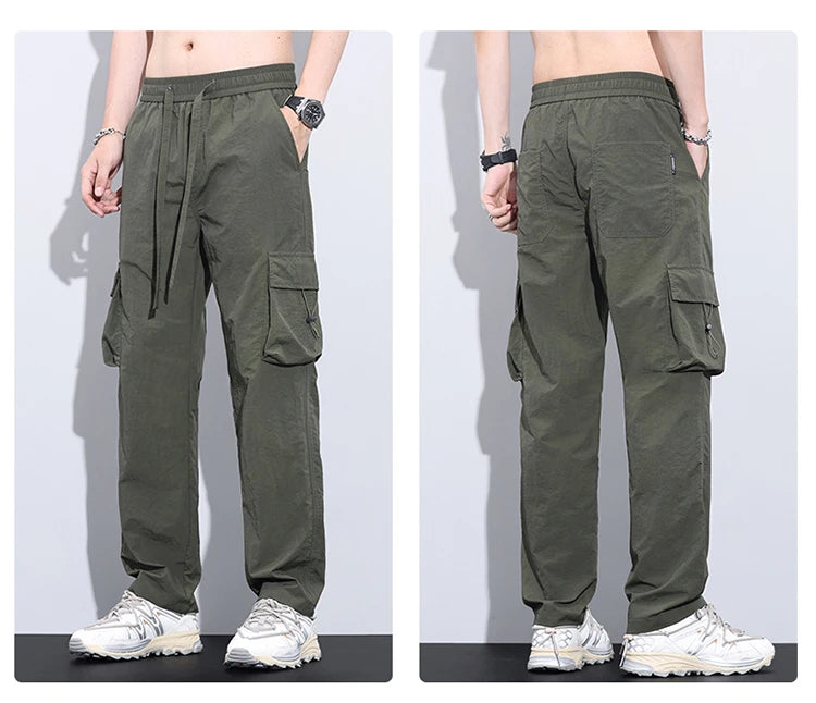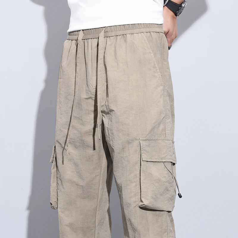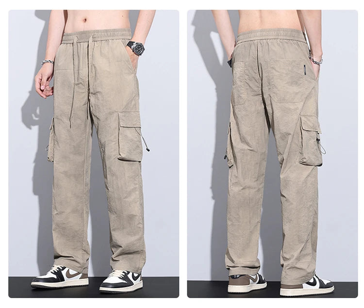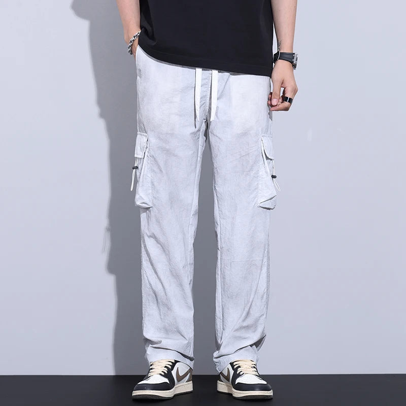New Summer Men's Ultra Thin Baggy Casual Pants American Retro Casual Trousers Drawstring Elastic Waist Straight Wide Leg Pants