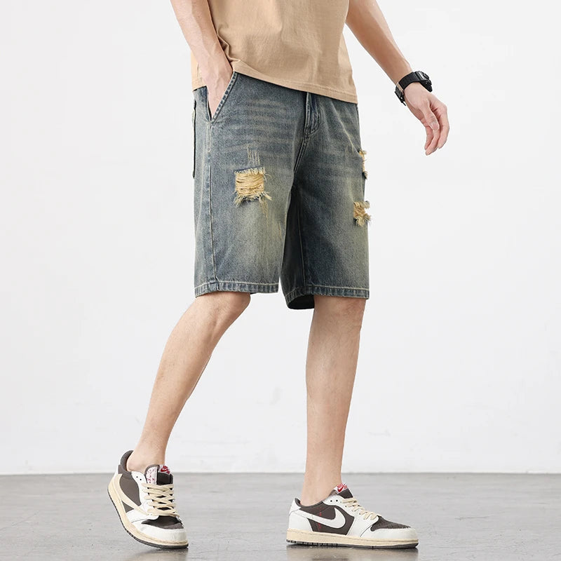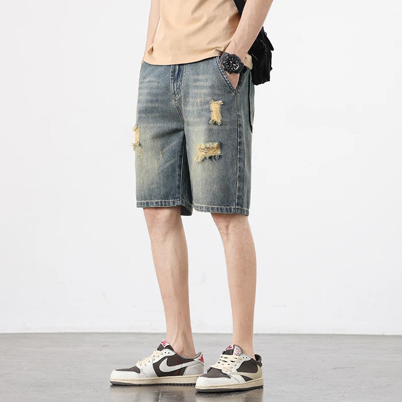 2024 Summer Men's Vintage Denim Shorts Ripped Holes Baggy Straight Casual Short Jeans Fashion Korean Hip Hop Streetwear