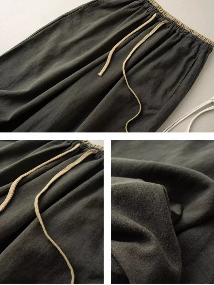 Summer Retro Cotton Linen Loose Harem Pants Elastic Drawstring Waist Casual Pants Basic Versatility Wide-leg Ankle-Length Pants