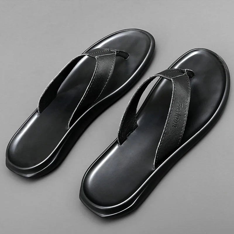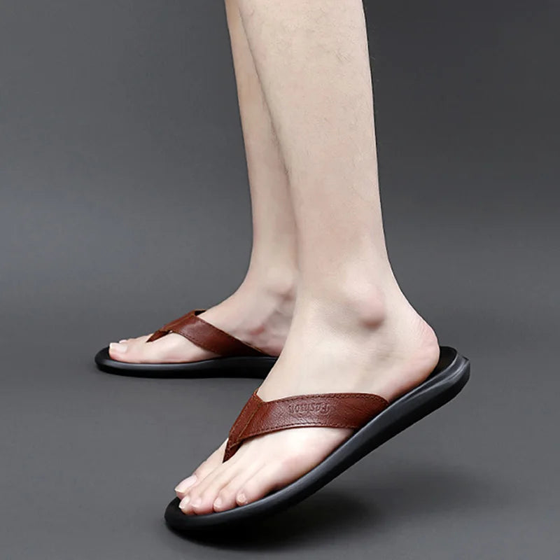 2023 Summer Shoes Men Slippers Flip Flops Flat Non-slip Genuine Leather Mens Summer Holiday Shoes Beach Male Footwear A4669