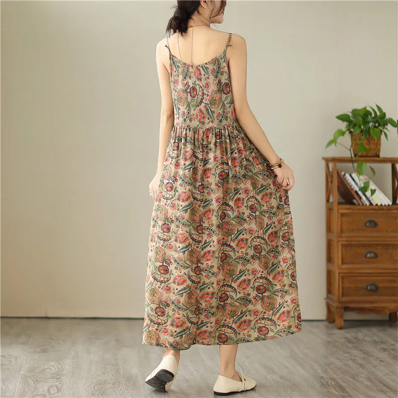 Summer Cotton Sleeveless Spaghetti Strap Print Vintage Long Dresses For Women 2023 New Casual Beach Dress Femme Elegant Clothing