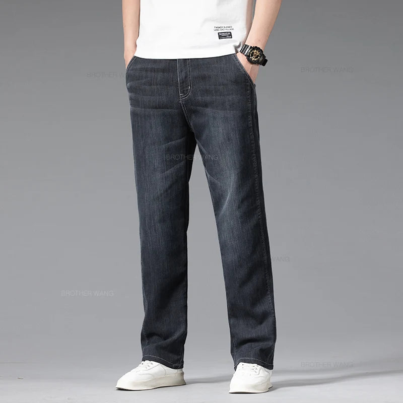 Summer Thin Jeans Men's Loose Straight Pants Fashion Elastic Waist Stretch Cotton Business Casual Denim Trousers Light Blue
