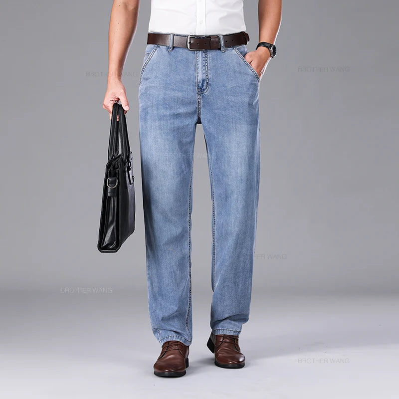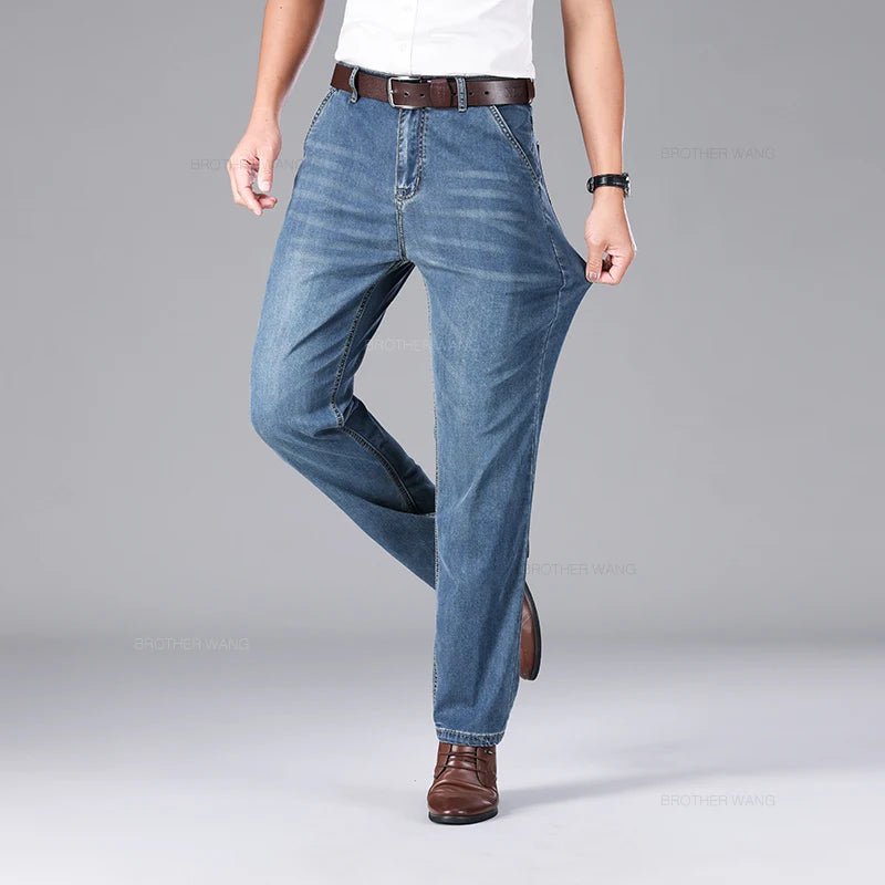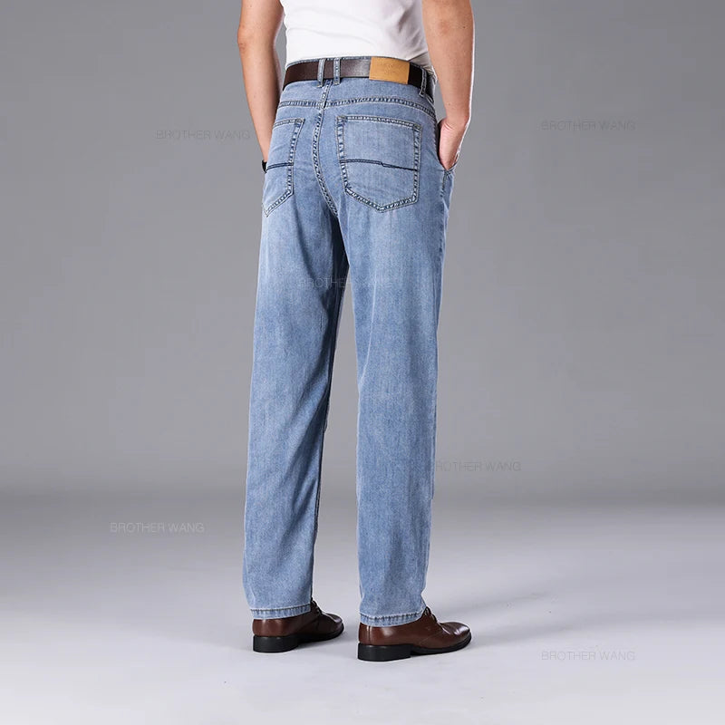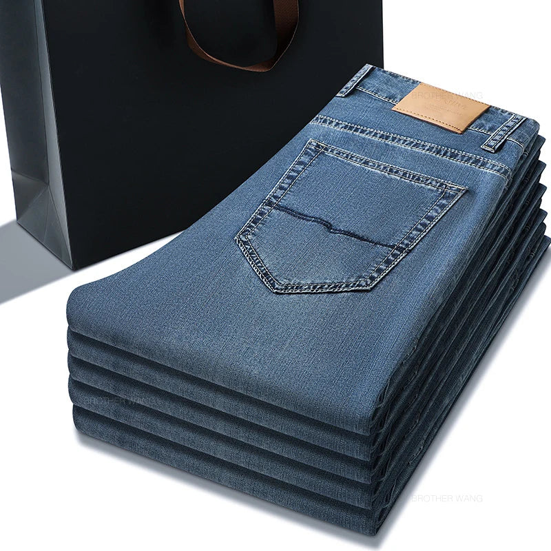 Summer Ultra-thin Men's Lyocell Ice Silk Jeans Business Straight Casual Drape Premium Trousers High Waist Elasticity Denim Pants