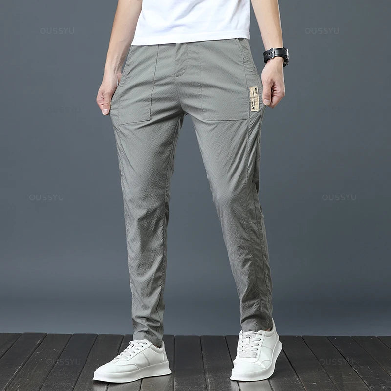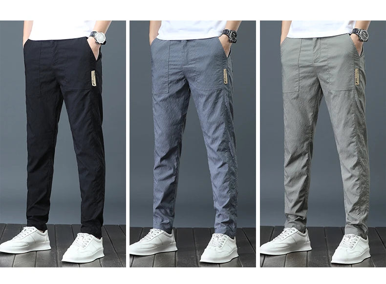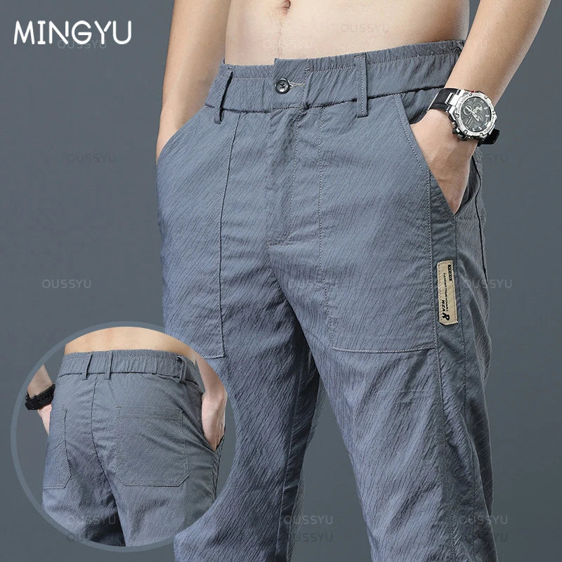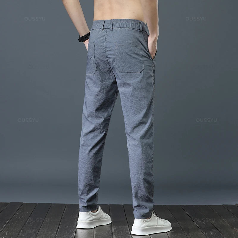 Summer Ultrathin Breathe Striped Pleats Casual Pants Men Stretch Slim Elastic Waist Business Classic Male Gray Green Trousers