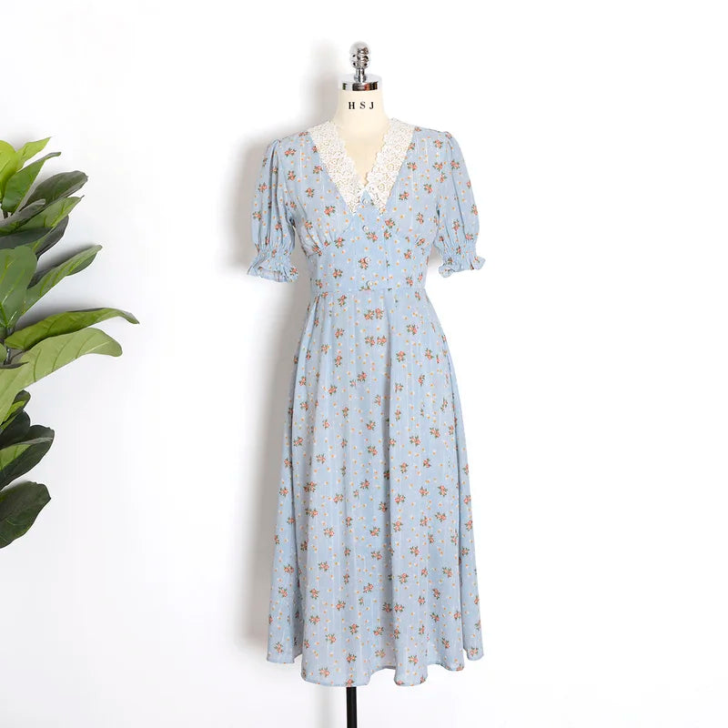 Vintage Floral Dress Women Elegant Lace Chiffon Korean Party Dress Puff Sleeve V Neck Midi Dress Fall Dresses for Women 2024