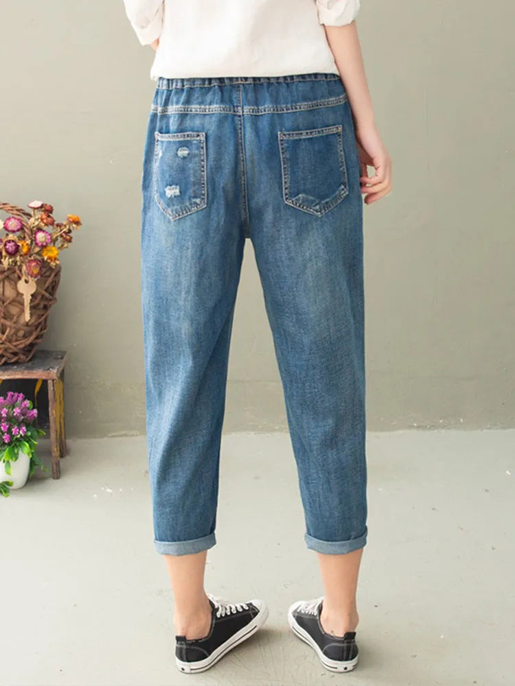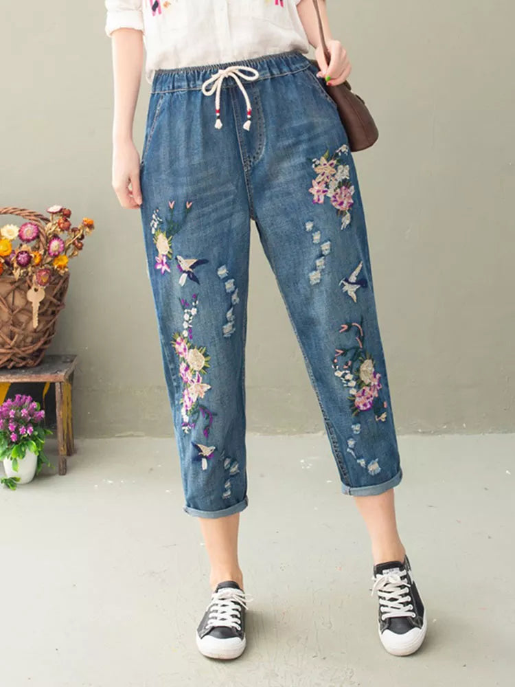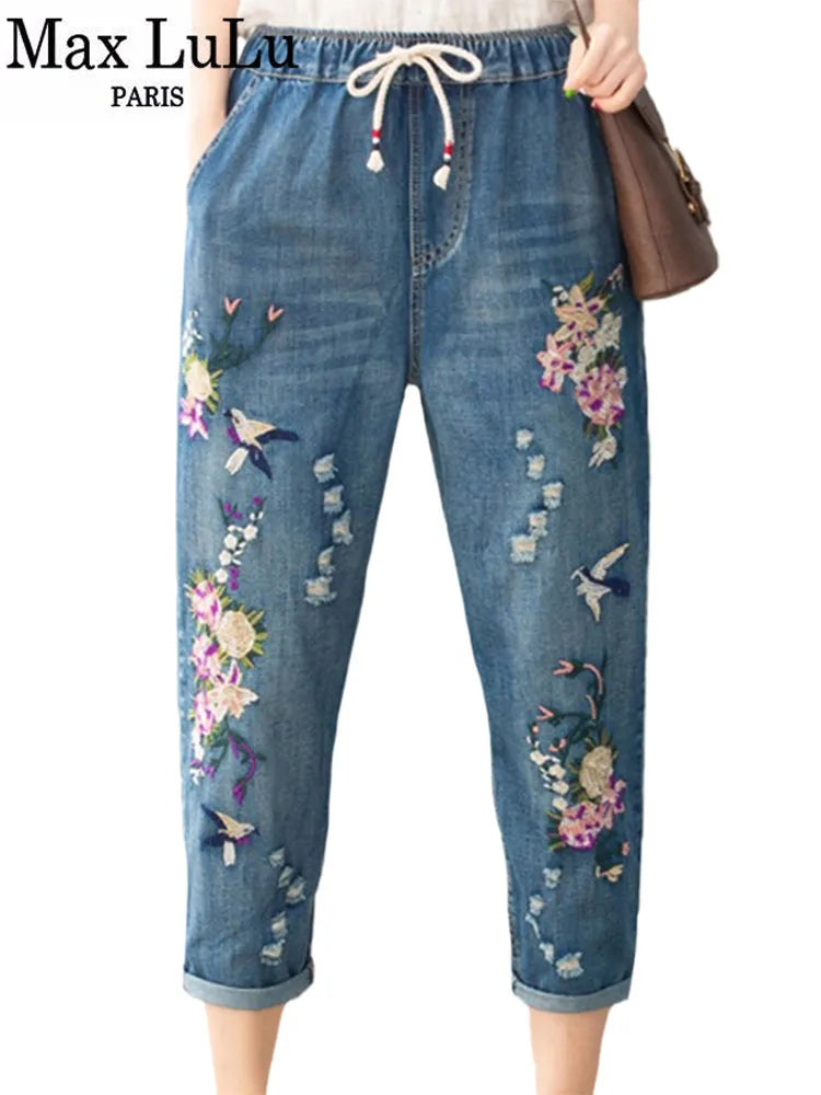 Womens Vintage Floral Loose Denim Pants 2022 Spring Chinese Style Casual Ripped Blue Jeans Holes Elastic Harem Trousers