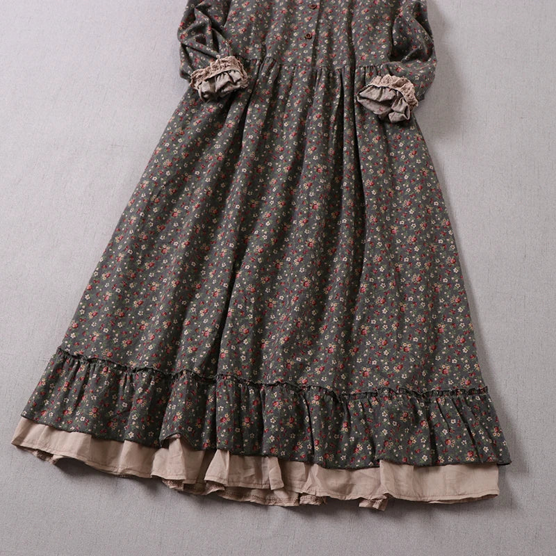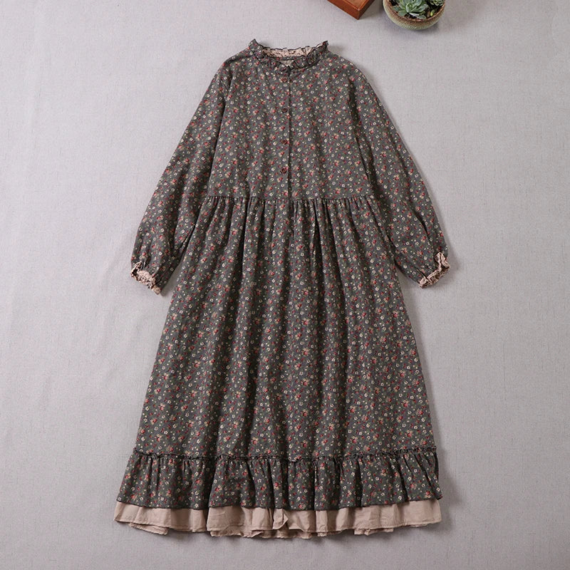 Japanese Mori Girl Vintage Floral Print Ruffled Cotton Dress Women Spring Autumn Long Sleeve Casual Loose Retro A-line Dresses