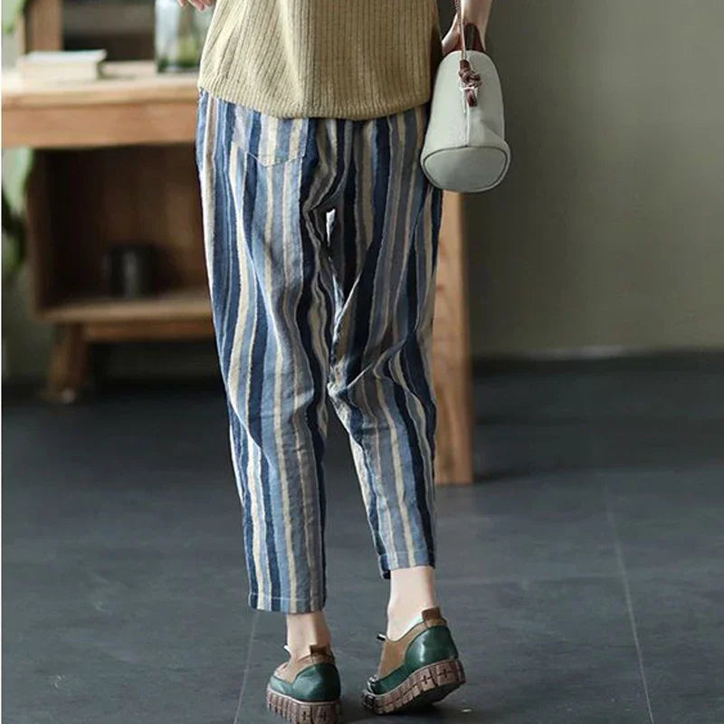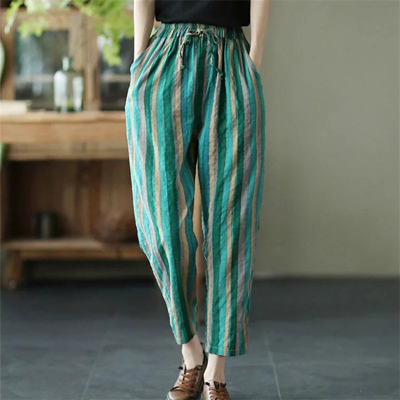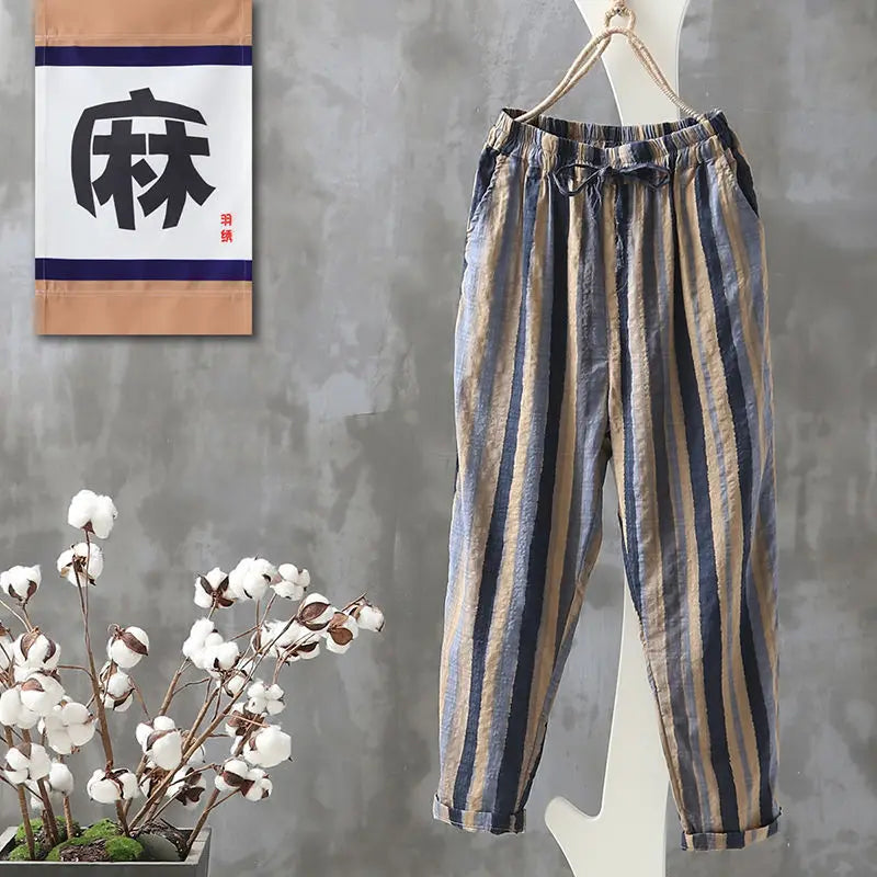 New Summer Wiomen Vintage Striped Print Cotton Linen Ankle Length Harem Pants Female Casual Elastic Waist Pockets Loose Trousers