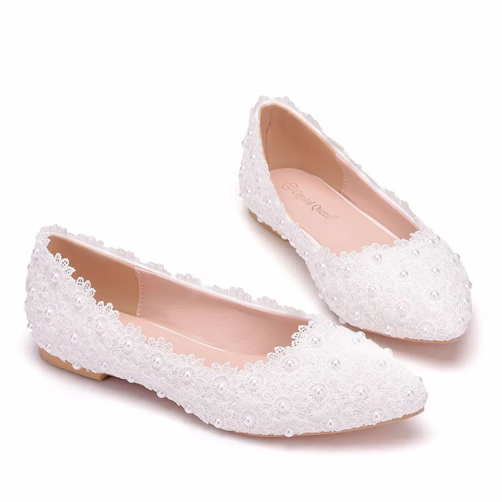 Crystal Queen White Lace Pearls Women Wedding Shoes Heel Casual Ladies Party Dress Flats Pointed Toes Size 43