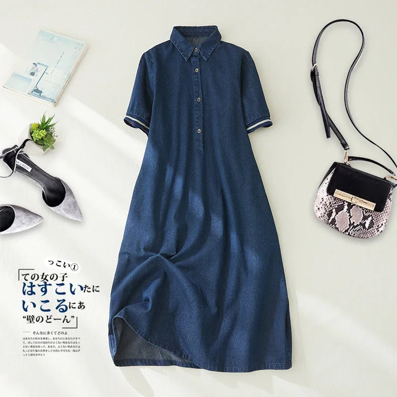 Women's Blue Denim Dress Summer Fashion Short Sleeve Polo Neck Vintage Mid-long French Style Elegant Basic Casual Slim Fit Frock